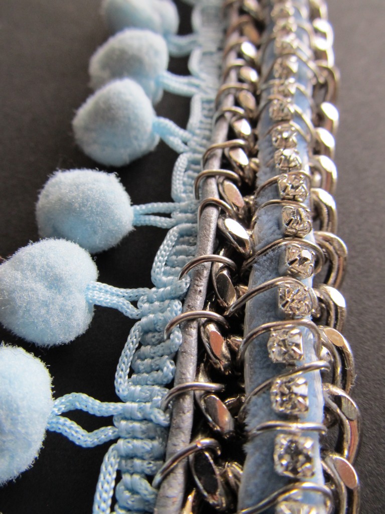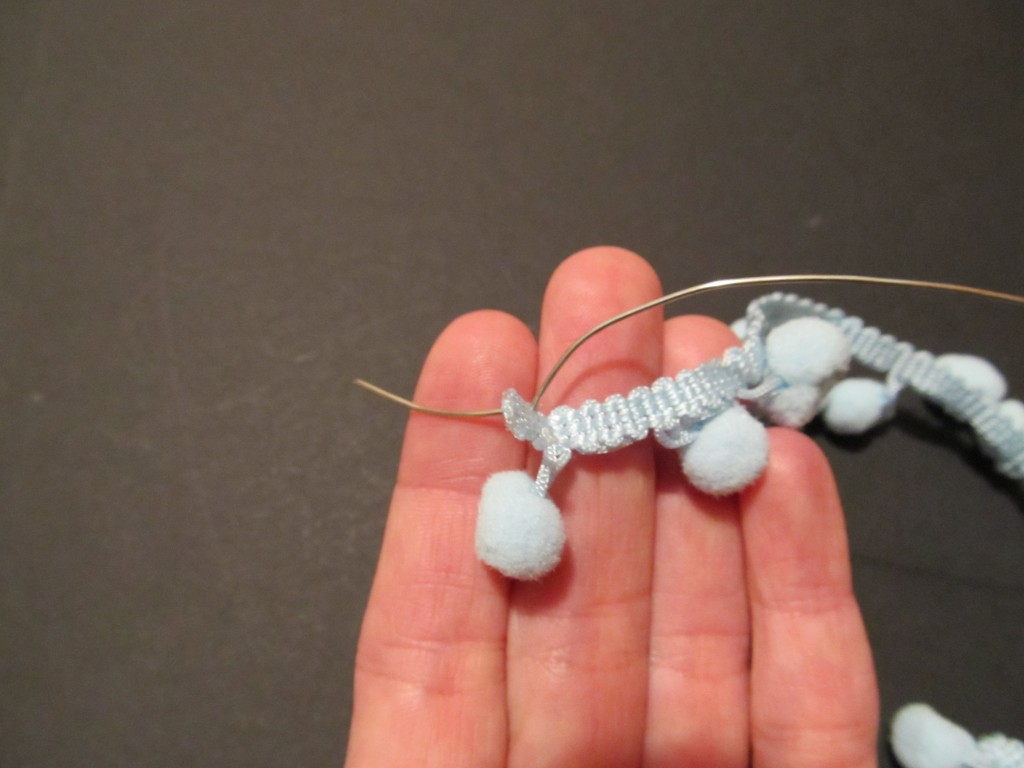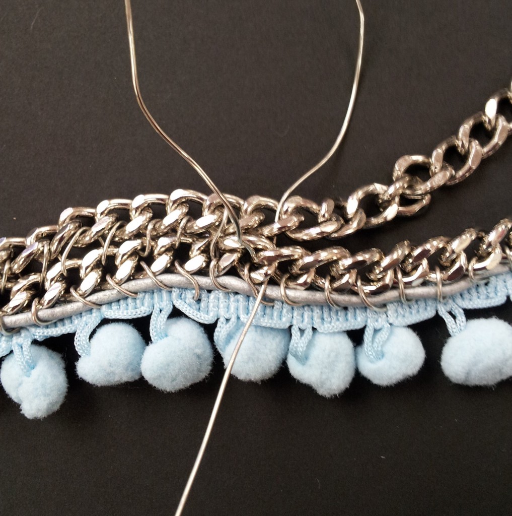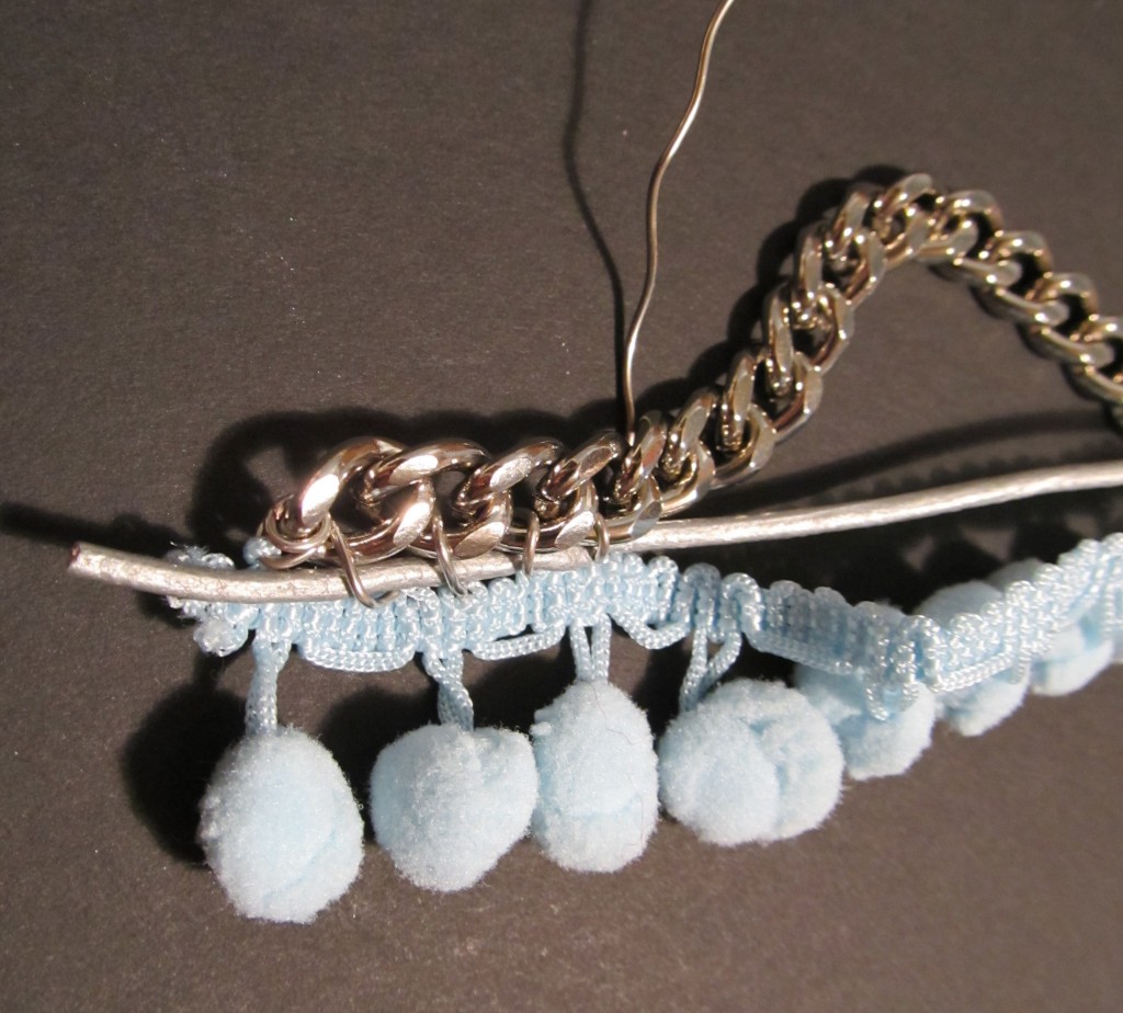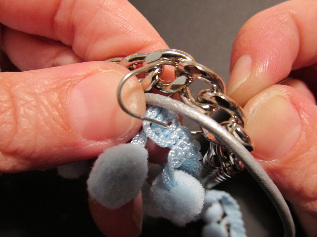 Attach the pompoms by threading the wire through the top hoop of the pompom and securing it to the chain. At the same time you are wrapping the pompom to the wire, slide the silver leather cording in.