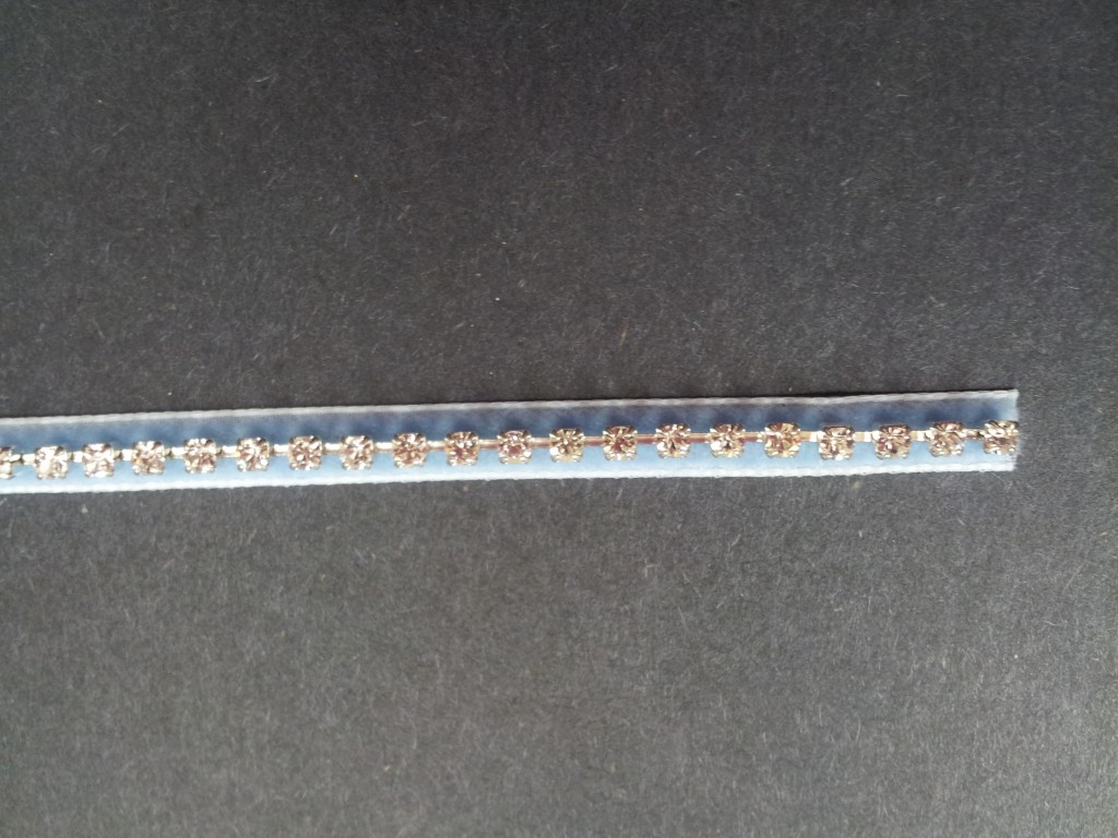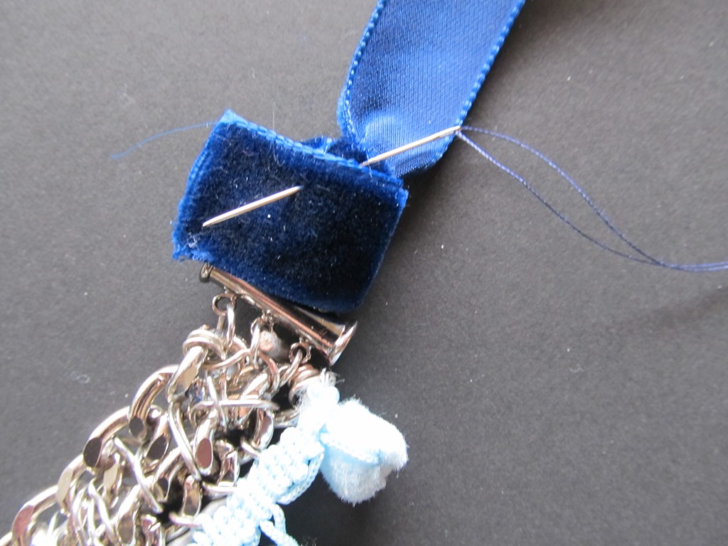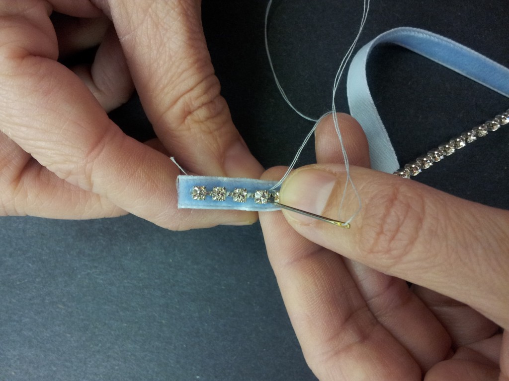 Measure the thinner of the two velvet ribbons so it runs the entire length of the chain. This is the ribbon that will run down the center top of the chain that has the rhinestones on it. Stitch with matching thread the rhinestones to the velvet ribbon. This will secure the rhinestones in place while you are wire wrapping.