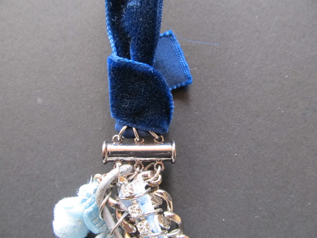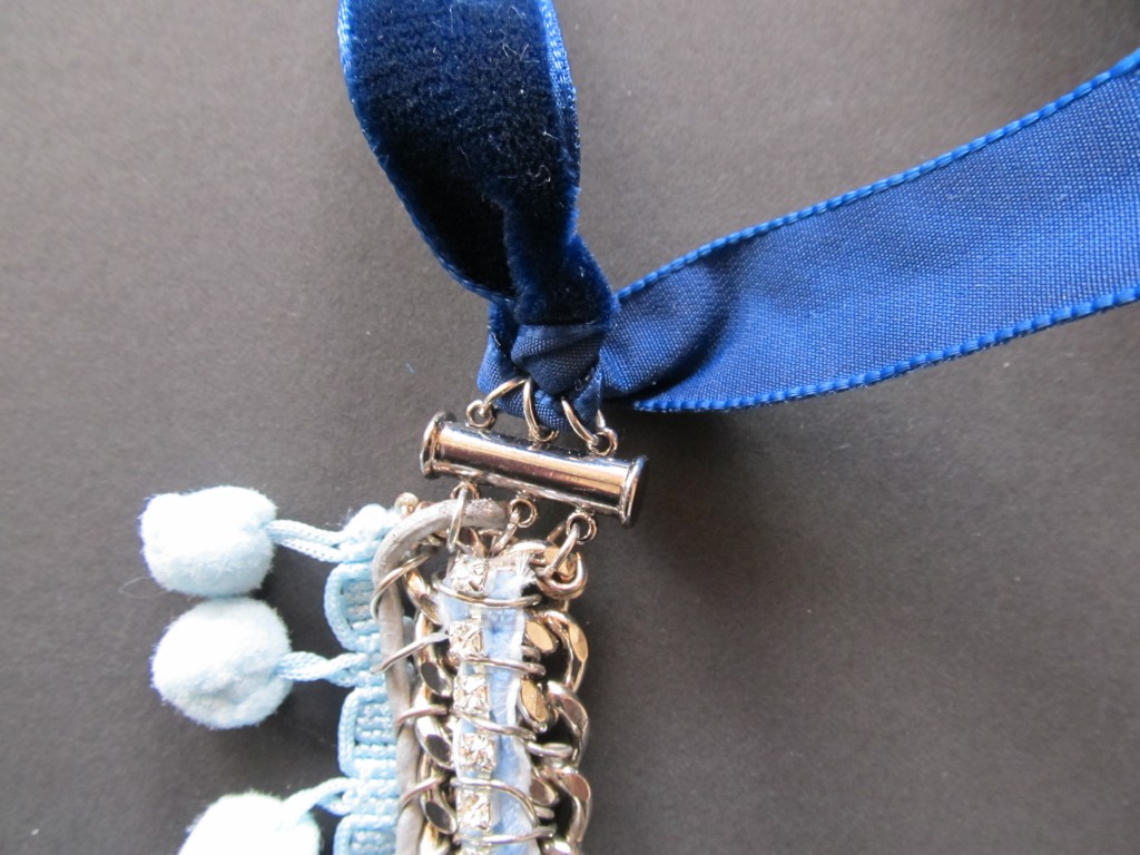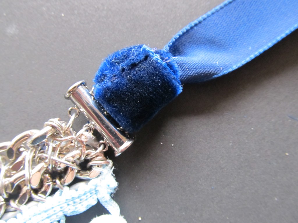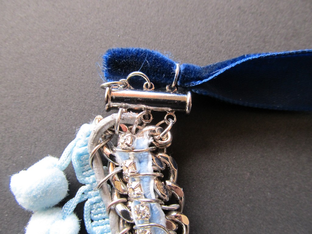 Feed the dark blue velvet through the jump rings. Leave enough ribbon to tie and make a knot. Also, have enough length of ribbon to be able to wrap the ribbon around itself a second time.