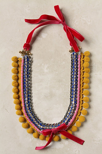 O.K. Who doesn’t love Anthropologie? But, the prices are sometimes unbelievable for their products. I happened upon this necklace called the Sol Pompom Necklace. It caught my eye because I love pompoms and thought this was such a clever use of them in a necklace. That got me thinking…I had to reverse engineer this necklace. And behold I did it! Except I did it for a fraction of the cost, only $20.00. This necklace has a retail price of $468.00. I had to laugh when they put it on sale for $249.95 because of what I made it for. Here’s what the original necklace looks like.