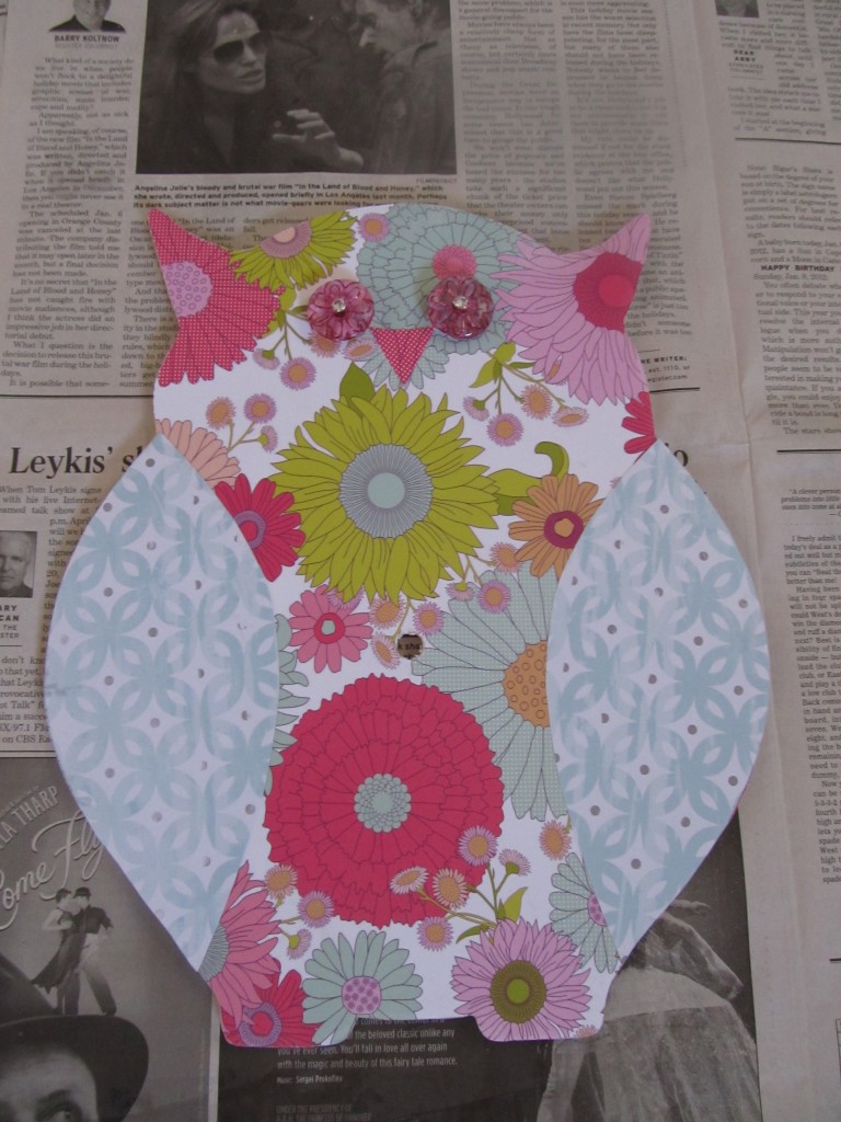 This is what I wrote for the contest. For challenge number two, I wanted to create a piece that was going to be both decorative and functional. My daughter loves owls and they also happen to be her grade school mascot. So, when I came across a wooden owl cut out, I knew it would work perfect for this project. To tie in to the colors of her bedroom, I pulled some coordinating decorative papers with the floral print and the blue design to mod podge to the surface of the owl. Button eyes were added to give it some sparkle & depth and a fun trim was used to finish the sides. This is a one of a kind clock that was a real “hoot” to make.