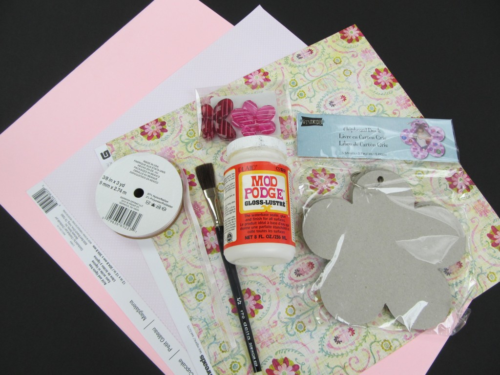 I got all of my supplies from Michael’s. Remember don’t forget your coupons. I found the cut out flower chipboard pieces in the dollar bin along with the acrylic butterflies.