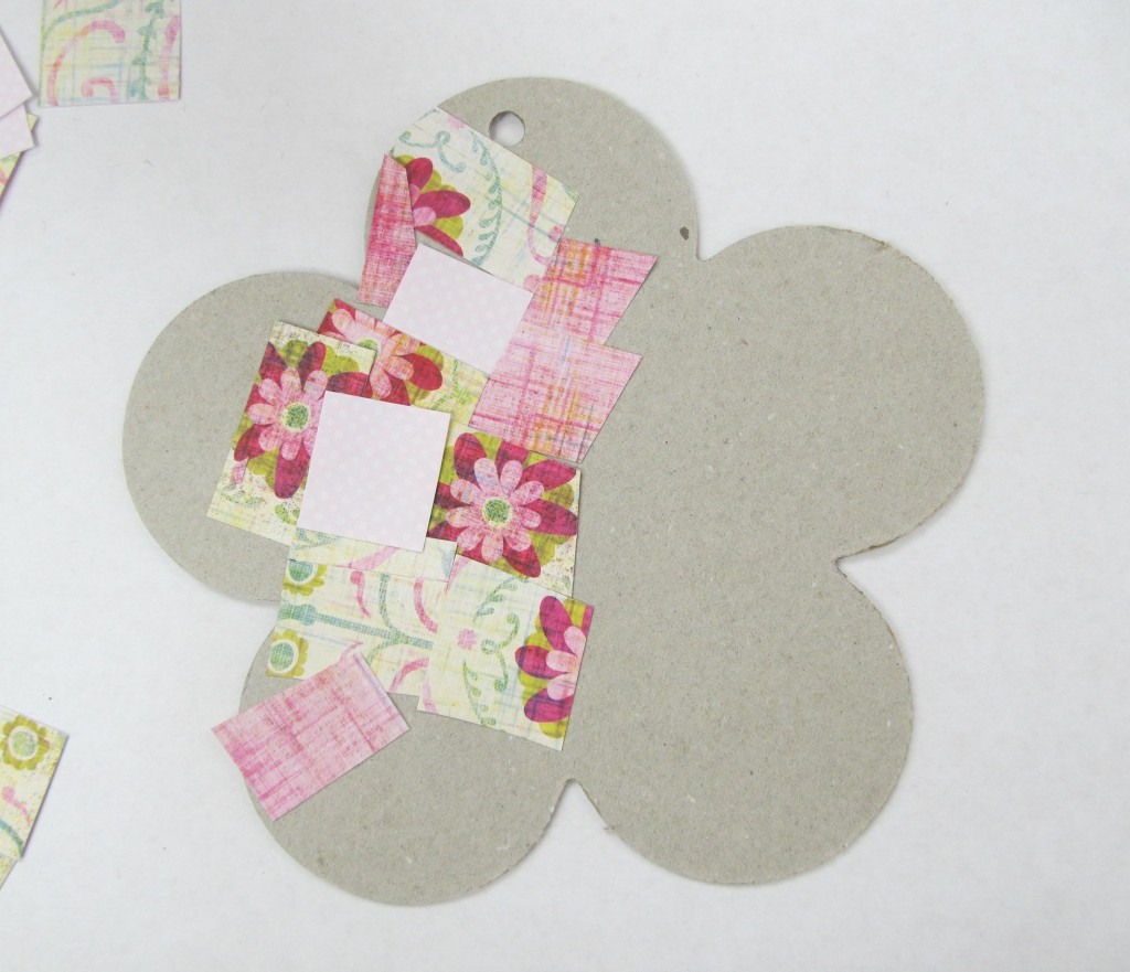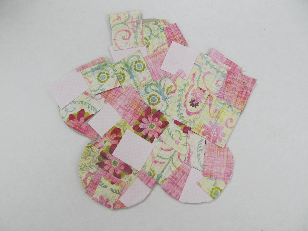 Start by cutting the decorative scrapbook paper into small rectangle/square pieces. These do not have to be exact. Older kids can be given strips of the decorative scrapbook paper and can cut the strips into the individual rectangle/square pieces themselves. Also, if you are trying to save time on the project, you can pre-cut these pieces.