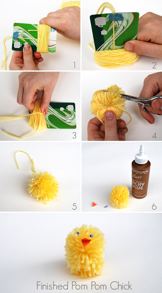 A: A simple method to make the pom pom is to wrap a piece of yarn around your fingers or a small cardboard ring many times, tie it in a knot in the middle with another short piece of yarn, then cut the loops to form the fluffy shape. For an easy pom pom chicks version, use yellow yarn and trim the bottom of the pom pom to flatten so the chick can sit upright.