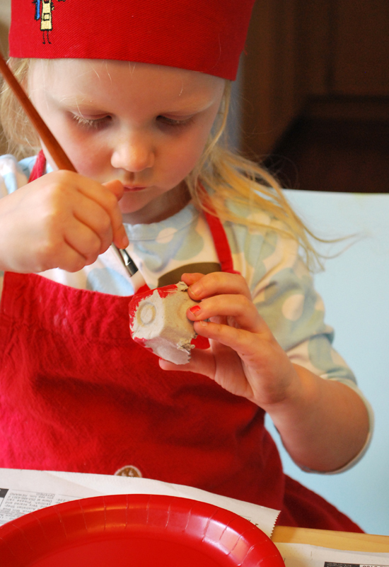 I recommend you start with the painting of the cardboard egg carton nests so that while they dry you can make pom poms. Begin by cutting the lid off of the egg carton. SAVE it! It makes the perfect paint palette that you can easily toss when you’re finished painting. I love easy clean up.