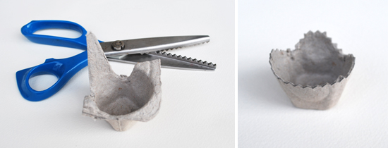 Next, separate the egg cups by cutting them apart. Once the cups are separated, go back with pinking shears to get a nice finished edge on the “nest” for the bunnies. Cut these so they look like a broken egg shell.
