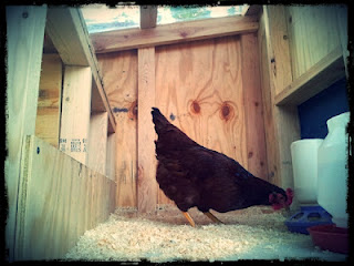 We built three boxes for each of our chickens and it has a shelf up above. If you notice, we put corrugated clear acrylic on the top of the coop. This allows for natural lighting and for ventilation of the heat through the holes. When the chickens are on the shelf, they can actually see out. It’s their penthouse view.