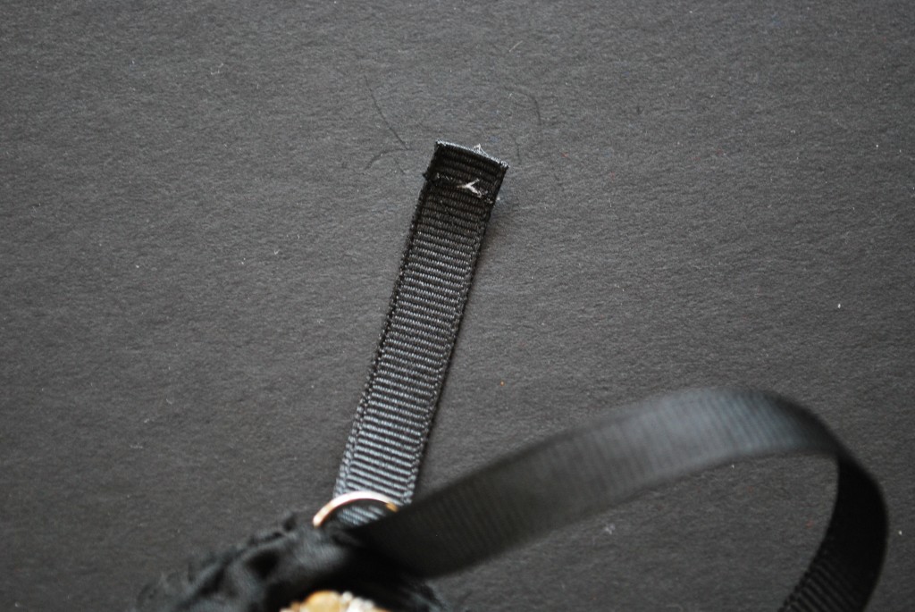 Now to create a finished edge that will not fray. Start by folding the edge underneath and hot gluing it into place. Sew the end to the main piece of ribbon. Make sure your D ring is looped into the ribbon. Repeat for the other side.